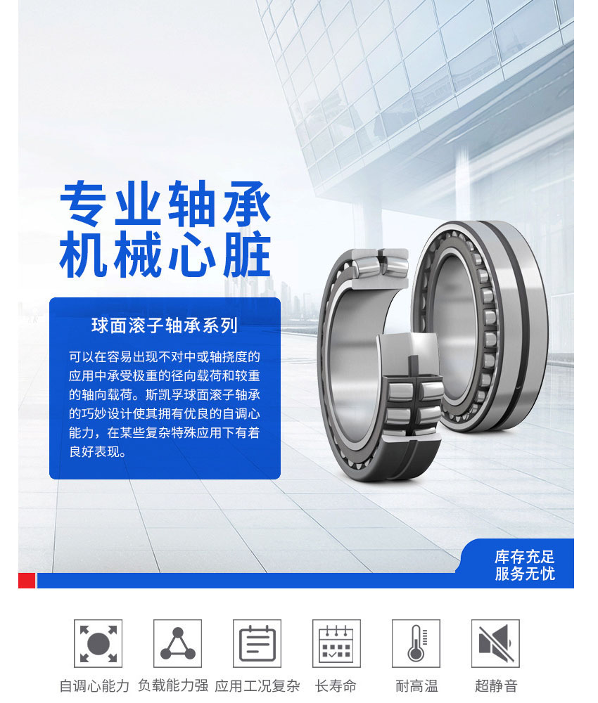 SKF球面滾子軸承的滾子的制造極為嚴格的公差尺寸和形式。每個輥子在集合中的其它輥的尺寸和形狀幾乎是相同的。優化負荷分布輥軸承的使用壽命。