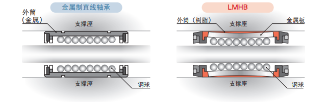 LMHB型借助THK自主設計的彎曲金屬板的彈簧效果,最大程度地縮小了鋼球與LM光軸之間的間隙,從而使動作更為順暢及安靜。