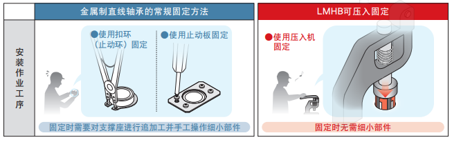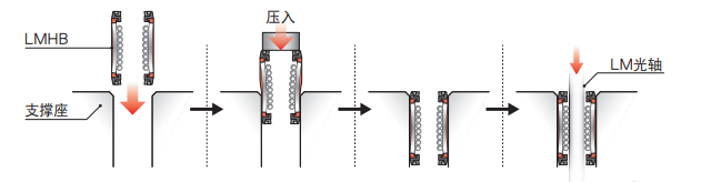 "LMHB型 "是通過壓入的方式在支撐座上進行安裝、可以減少安裝工時,從而提高生產效率并實現安裝自動化。