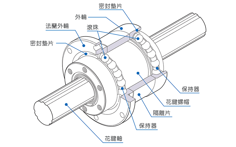 大扭力負荷能力、對于同時承受扭力和徑向負荷的扭力傳輸機構和地點為最佳選定、旋轉方向間隙為零、防止滾珠脫落保持器型。主要用途、裝配機器人的 Z 軸、自動裝卸機、連續自動工作機械、自動搬送設備、繞線機、研磨床主軸驅動軸。